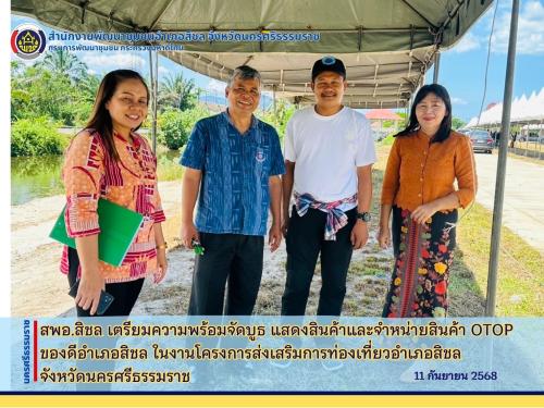 นางขวัญตา ปราณสุข พัฒนาการอำเภอสิชล ได้มอบหมายให้เจ้าหน้าที่พัฒนาชุมชนอำเภอสิชลเตรียมความพร้อมจัดบูธเพื่อแสดงสินค้าและจำหน่ายผลิตภัณฑ์ OTOP ในงานโครงการส่งเสริมการท่องเที่ยวอำเภอสิชล จังหวัดนครศรีธรรมราช ซึ่งงานดังกล่าวจะจัดในวันที่ 13 กันยายน 2568 กิจกรรมมีการแข่งขันนกปรอดหัวโขน(นกกรงหัวจุก) มีงานดนตรีชมฟรี ศิลปินดัง และมีการจัดจำหน่ายสินค้า OTOP -ของดีอำเภอสิชล จังหวัดนครศรีธรรมราช